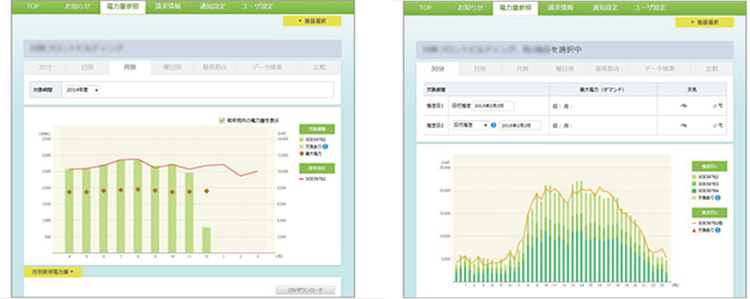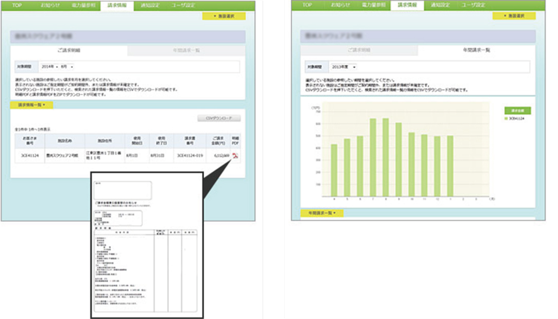 電気使用量をグラフ・表で表示します。またデータのダウンロードも可能です。複数施設をご契約中のお客さまは、まとめ表示等も可能です。