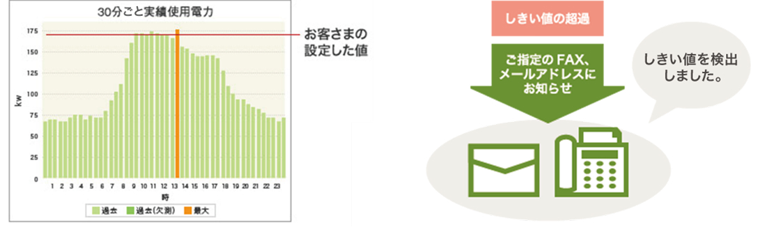 お客さまの設定した、しきい値を超過した場合に、ご指定の宛先(メール・FAX)へ通知します。